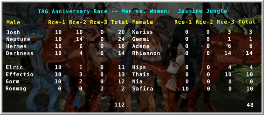 A great time was had by all, as we battled it out for Tharlarion Supremacy between the Males and Females. The tournament was organized by Hermes, and had 16 racers participating. It turned out to be a resounding win for the Men, with a cumulative 424 points over the Women’s 205 points.
